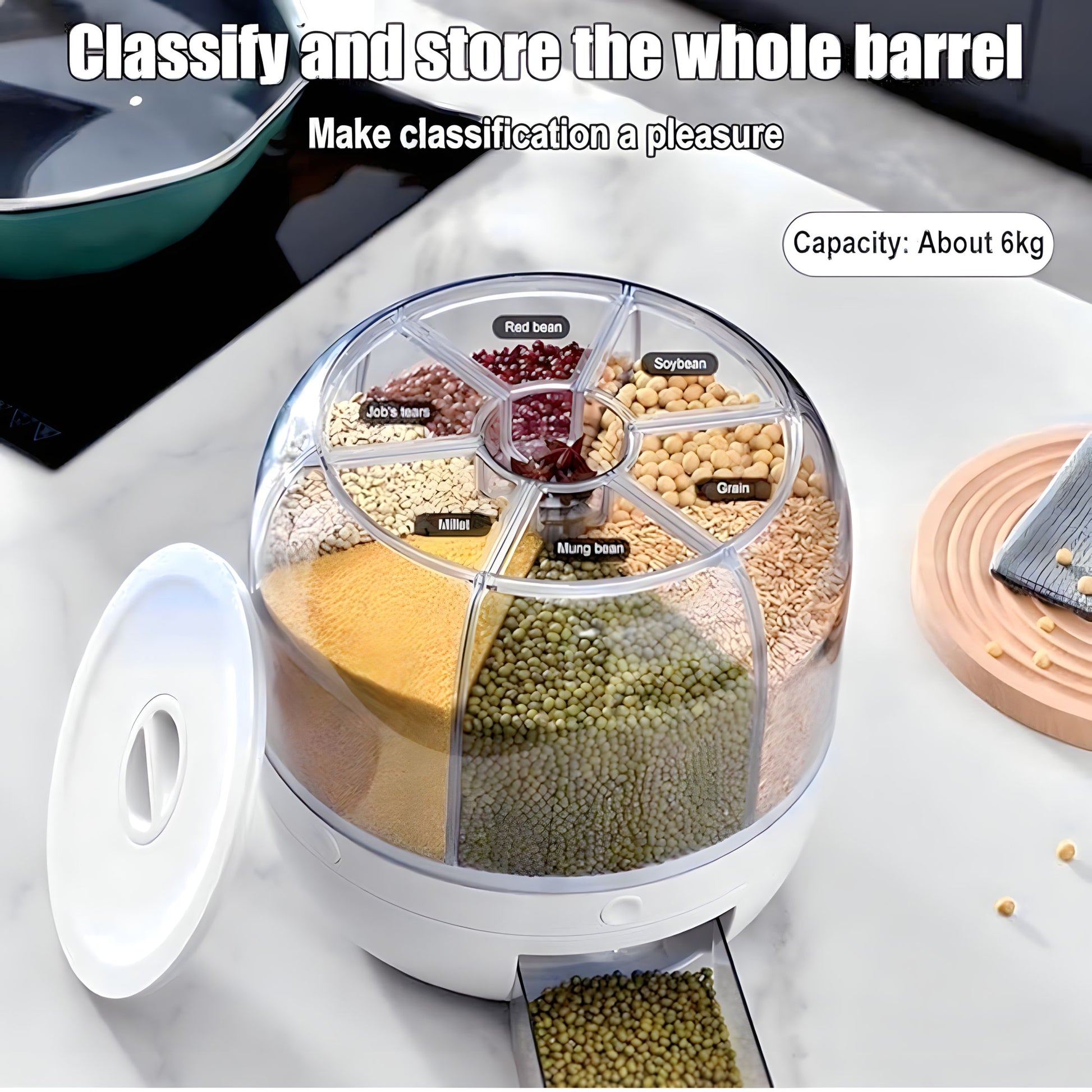 With 6 separate compartments and a 360° rotating design, you can easily access the ingredients you need in seconds. Simply rotate, press the button, and dispense your desired quantity directly into the drawer — no spills, no mess!